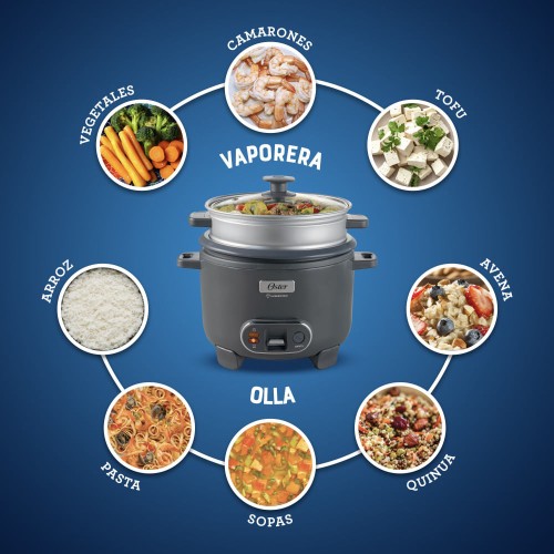 La Arrocera 3 en 1 de Oster simplifica tus comidas diarias. Cocina arroz sin que se pegue, gracias a su recubrimiento antiadherente Oster DiamondForce, que además es 15 veces más fácil de limpiar* y no se daña ni se desgasta con el uso**. Sofríe ingredientes como cebolla o ajo antes de agregar arroz, quinoa o lo que prefieras. Usa la vaporera para cocinar vegetales o pescado al mismo tiempo. Las asas están diseñadas para sostener la tapa y la cuchara cómodamente, mientras que la función Mantener Caliente asegura que todo esté siempre a la temperatura perfecta.